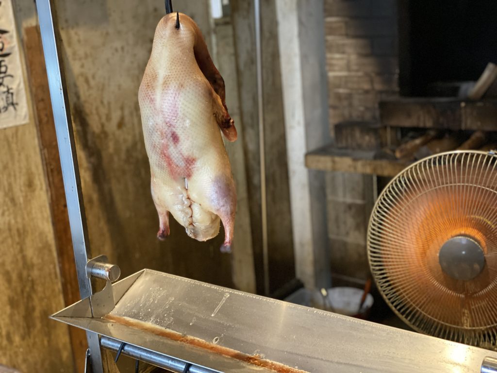 このアヒルをこんがり焼き上げると、高級食材『北京ダック』に生まれ変わる。