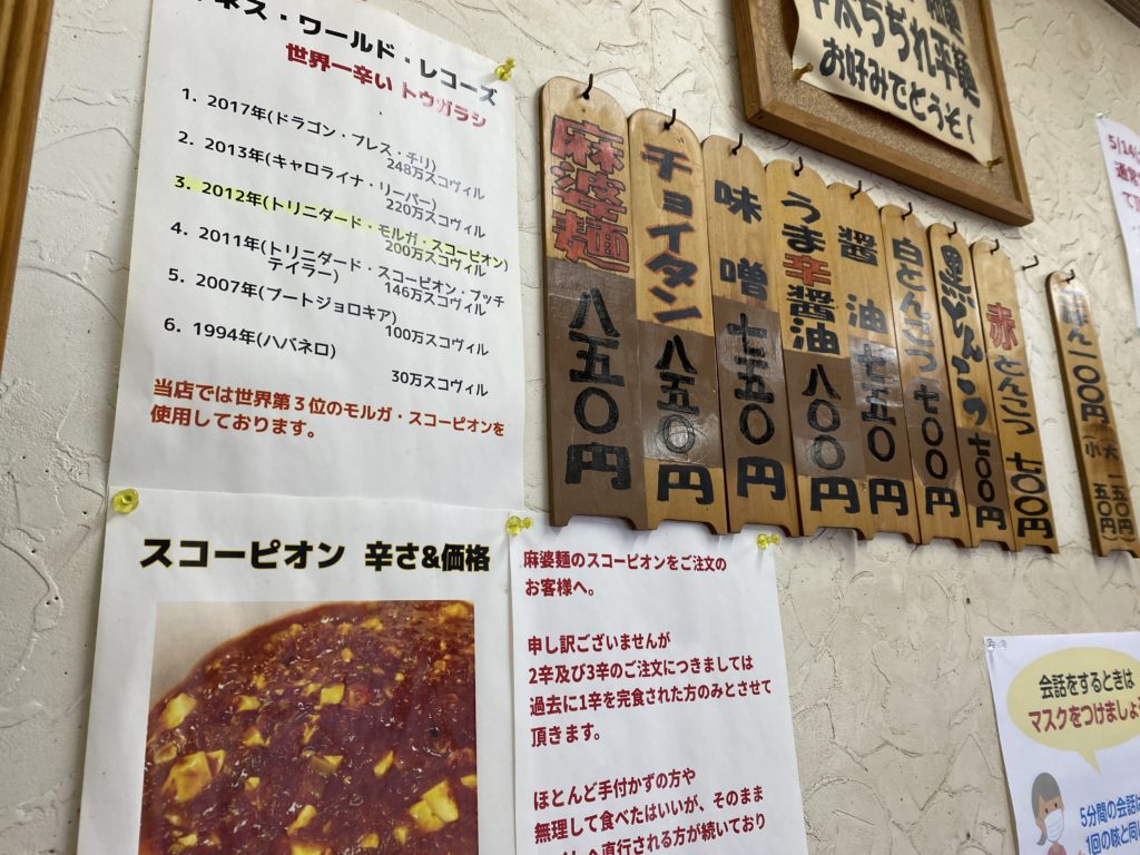 ここにある激辛メニュー『麻婆麺3辛』は、ギネス認定の辛さを誇る『トリニダート・モルガ・スコーピオン』を使用しており、食べた方ほとんどの方が悶絶する料理です。